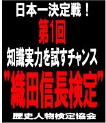 第1回 織田信長検定あなたの日本全国での、織田信長知識レベルを試してみませんか!今まで、織田信長に対する知識は充分だと自分では感じていても、実際に自分の知識は、全国でどのくらいなのか、試す機会や場所が、ありませんでした。そこで、歴史人物検定協会では、日本全国でのあなたの、織田信長の知識実力を調べます。全国3位までに入選されますと、賞状および記念品の授与。85点以上であれば、織田信長知識が知識が優れていると判断し、認定書を授与させて頂きます。上記以外の方は、当ホームページにて、順位を発表(名前では無しに、受験番号)させて頂きます。戦国時代好き、戦国武将好き、織田信長好きなあなたの実力知識を存分に発揮してください。お申し込み期間 平成21年11月11日 〜 平成22年3月7日第1回織田信長検定日 平成21年 3月21日(日) 9時50分 安土町城郭資料館前集合 10時00分 〜 13時30分 安土城跡、信長の館、安土 城考古博物館の散策 14時00分 〜 15時30分 第1回織田信長検定(会場 地:安土城考古博物館) 15時45分 〜 16時45分 歴史講和(仮称:織田信長 の知られざる実態) 17時30分 〜 19時00分 懇親会(会場地:城郭資料 館)第1回を記念して、記念検定料金 3,500円(歴史史跡散策入館料金、検定受験料金、講演会料金を含む特別料金)懇親会料金 3,000円 (希望者のみ) *懇親会のみの参加はできません。*お振込完了をもって、受付完了とさせて頂きます。 *原則、いかなる理由であっても、ご入金後のご返金はで きませんので、ご了承ください。 検定試験は、マークシート方式では無しに、全て筆記にて、ご回答頂きます。歴史は色々な解釈ができる場合が多々ありますが、当協会が妥当だと判断するものを、回答とします。回答時間は、90分間。 初級知識問題、10%中級知識問題、40%上級知識問題、50%*不正を見つけた場合は、即刻退場を命じさせて頂きます。*上記の場合、料金の返金は致しません。検定会場滋賀県立安土城考古博物館〒521-1311 滋賀県蒲生郡安土町下豊浦6678 TEL:0748-46-2424 鉄道: JR琵琶湖線「安土駅」より徒歩25分 JR琵琶湖線「安土駅」よりレンタサイ クル9分 お車: 名神高速道路竜王?.Cより車で約20 分 どうぞ、あなたの織田信長知識の実力を試してみてください!