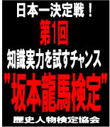 第1回 坂本龍馬検定あなたの日本全国での、坂本龍馬知識レベルを試してみませんか!今まで、坂本龍馬に対する知識は充分だと自分では感じていても、実際に自分の知識は、全国でどのくらいなのか、試す機会や場所が、ありませんでした。そこで、歴史人物検定協会では、日本全国でのあなたの、坂本龍馬の知識実力を調べます。全国3位までに入選されますと、賞状および記念品の授与。85点以上であれば、坂本龍馬知識が知識が優れていると判断し、認定書を授与させて頂きます。上記以外の方は、当ホームページにて、順位を発表(名前では無しに、受験番号)させて頂きます。戦国時代好き、戦国武将好き、坂本龍馬好きなあなたの実力知識を存分に発揮してください。お申し込み期間 平成21年11月11日 〜 平成22年7月4日第1回坂本龍馬検定日 平成21年 7月18日(日)受付時間 12:45 〜 13:15受験時間 13:30 〜 15:00懇親会予定時間 15:15 〜 16:45検定料金 7,000円懇親会料金 3,000円 (希望者のみ) *懇親会のみの参加はできません。*お振込完了をもって、受付完了とさせて頂きます。 *原則、いかなる理由であっても、ご入金後のご返金はで きませんので、ご了承ください。 検定試験は、マークシート方式では無しに、全て筆記にて、ご回答頂きます。歴史は色々な解釈ができる場合が多々ありますが、当協会が妥当だと判断するものを、回答とします。回答時間は、90分間。 初級知識問題、20%中級知識問題、40%上級知識問題、40%*不正を見つけた場合は、即刻退場を命じさせて頂きます。*上記の場合、料金の返金は致しません。検定会場新大阪丸ビル 新館 F会議室等〒533-0033 大阪市東淀川区東中島1丁目18番5号 TEL:06-6321-1516 新大阪駅東口より150mです。 階段を下りて右手道なりにお進みください。 お車で来られる場合は、お近くのパーキング にお停めください。どうぞ、あなたの坂本龍馬知識の実力を試してみてください!